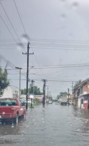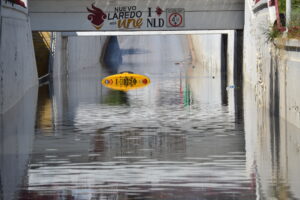 Nuevo Laredo, Tamaulipas.- Una lluvia muy intensa cayó sobre la ciudad durante la madrugada de este jueves, fenómeno que ocasionó inundaciones severas en varias áreas, principalmente en avenidas muy concurridas, lo que dejó enormes baches y vehículos varados, entre ellos un camión de transporte de trabajadores de una maquiladora que fue cubierto por el agua hasta el techo en el desnivel de la calle Anáhuac, una arteria que comunica parte del poniente de la ciudad con importante zona céntrica.